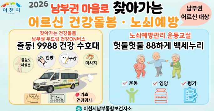 [뉴스앤톡] 이천시는 남부권 어르신을 대상으로 의료 접근성을 높이기 위한 ‘출동! 9988 건강수호대’와 운동교실에 노쇠예방관리를 접목한 ‘헛둘헛둘 88하게 백세누리’ 사업을 2026년 본격 운영한다.