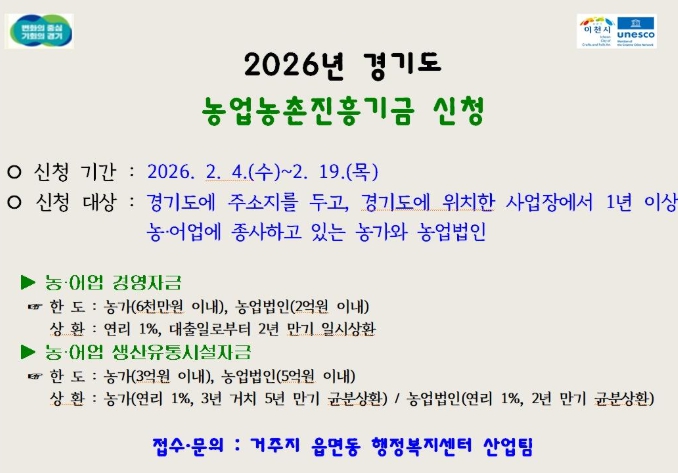 [뉴스앤톡] 이천시는 농업인에게 장기·저리 융자 지원을 실시하고 경영안정을 돕기 위해 2026년 경기도 농업농촌진흥기금 농어업 경영자금, 농어업 생산유통시설자금 사업에 대한 신청을 2월 3일부터 접수한다.