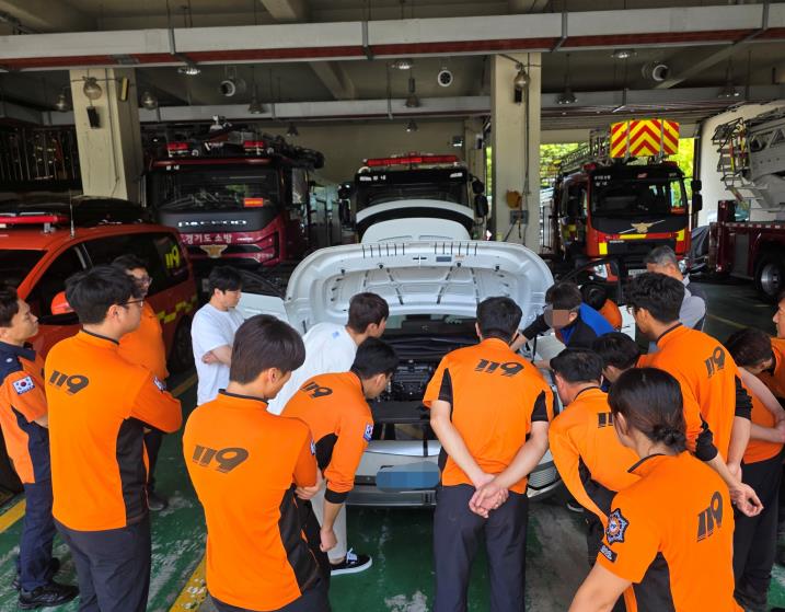 이번 교육에는 119안전센터, 구조대 등 소방서 직원 40여 명이 참여했으며, 현대자동차 북부하이테크센터 전문 강사가 직접 방문해 이론과 실습을 병행한 맞춤형 교육을 진행했다. 이론 과정에서는 친환경차 구조 이해, 전기·수소차 식별법, 고전압 안전장치와 응급조치 요령 등을 다뤘으며, 실습 과정에서는 전기차 구조 작업, 고전압 시스템 비활성화, 사고 차량 지지 및 방전 차량 문 개방 방법 등을 집중 훈련했다.
