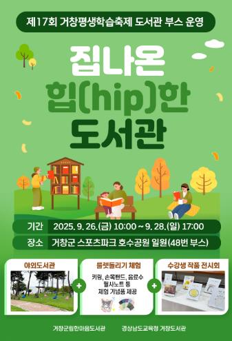 [뉴스앤톡] 거창군립한마음도서관과 경상남도교육청 거창도서관은 오는 26일부터 28일까지 3일간 거창군 스포츠파크 일원에서 개최되는 제17회 거창평생학습축제 동안 『집나온 힙(hip)한 도서관』 부스를 운영한다고 밝혔다.
