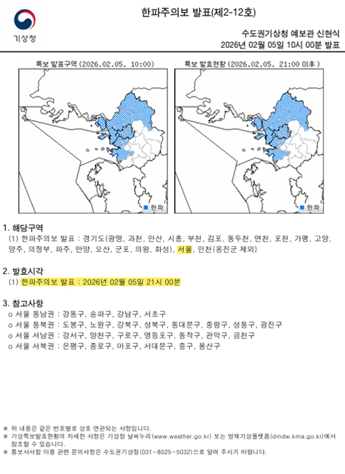 [뉴스앤톡] 입춘을 맞아 한풀 꺾였던 추위가 다시 고개를 들 것으로 보인다. 5일 밤 9시를 기점으로 서울 전역(동남권·동북권·서남권·서북권)에 한파주의보가 발효됨에 따라, 서울시는 한파 종합지원상황실을 가동하고 자치구 및 유관기관과 협력해 시민 보호와 취약시설 안전관리를 강화에 나섰다.