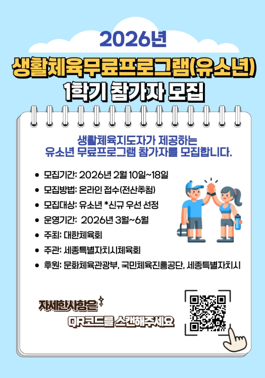 [뉴스앤톡] 세종특별자치시체육회는 세종특별자치시에 거주하는 유소년을 대상으로 「2026년 생활체육지도자 생활체육 무료교실 1학기」 참가자를 모집한다.