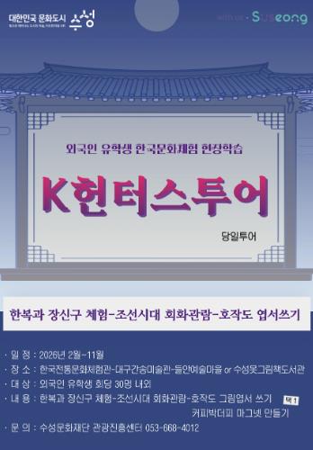 [뉴스앤톡] 대구 수성문화재단은 올해 2월부터 11월까지 대구·경북 외국인 유학생을 대상으로 한국문화체험 현장학습 ‘K헌터스 투어’를 운영한다.