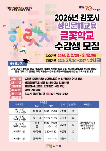 [뉴스앤톡] 김포시는 배움에 대한 열정을 다시 시작하고자 하는 시민을 대상으로 2026년 성인문해교육 ‘글꽃학교’ 수강생을 2월 2일부터 2월 12일까지 모집한다고 밝혔다.