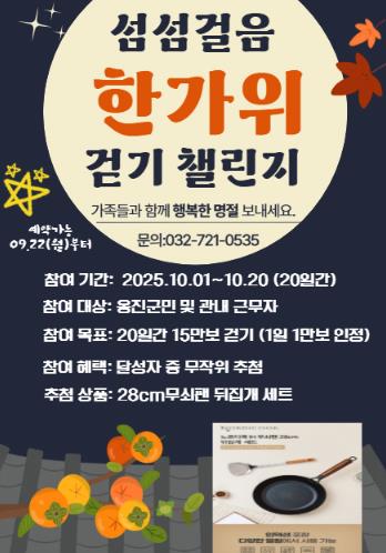 [뉴스앤톡] 옹진군은 오는 22일부터, 10월 가을철 군민 건강증진과 걷기 실천 확산을 위해 '섬섬걸음 한가위 걷기 챌린지'참가자를 모집한다고 밝혔다.