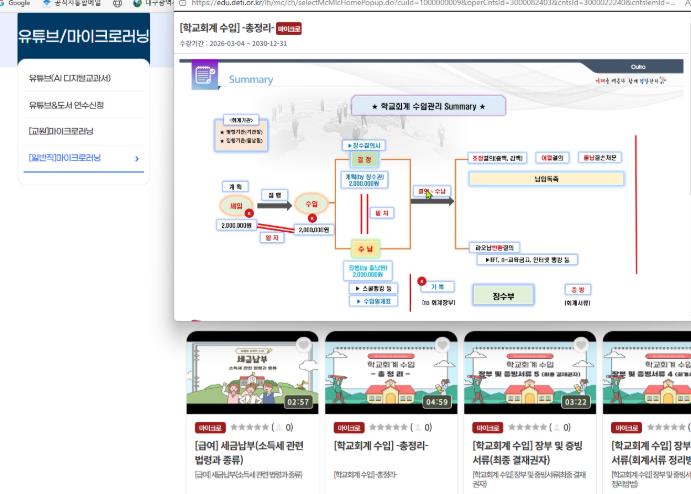 연수 과정은 ▲공무원 급여·수당 ▲교육공무직원 급여·각종수당·연차유급휴가·퇴직금 ▲ 4대보험 ▲ 연말정산 ▲학교회계 수입 등 급여 및 세입 업무와 관련된 총 129개 세부 강좌로 구성되어 있으며, 각 강좌는 1~13분 내외의 콘텐츠로 제작되어 있고 PC와 모바일을 통해 반복 수강이 가능하다.
