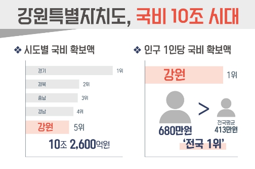 [뉴스앤톡] 강원특별자치도는 국비 확보 10조 시대에 진입한 가운데, 인구 1인당 국비 확보액이 약 680만 원으로 전국 1위에 해당한다고 밝혔다.