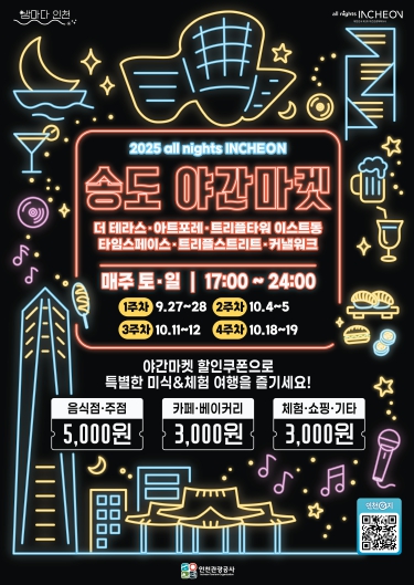 [뉴스앤톡] 인천광역시와 인천관광공사(사장 백현)는 9월 27일부터 10월 19일까지 매주 토·일 4주간 송도 일대 6개 상권에서 풍성한 할인혜택과 더불어 상권별 다양한 행사를 즐길 수 있는‘2025 all nights INCHEON 송도 야간마켓’을 개최한다고 밝혔다.