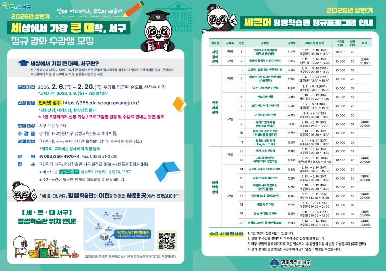 [뉴스앤톡] 광주광역시 서구는 ‘세상에서 가장 큰 대학, 서구(이하 세큰대)’ 상반기 정규강좌 수강생을 모집한다.