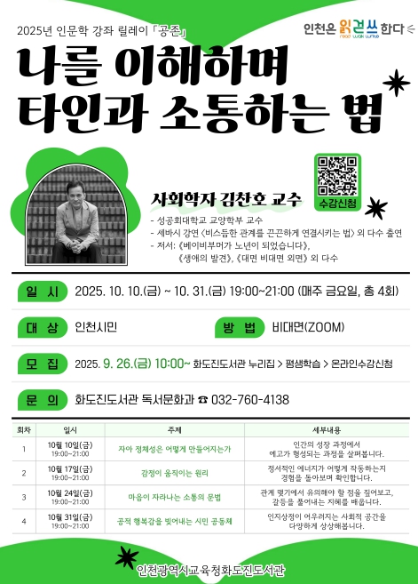 [뉴스앤톡] 인천광역시교육청화도진도서관은 10월 10일부터 31일까지 매주 금요일 4회에 걸쳐 인문학 강좌 ‘나를 이해하며 타인과 소통하는 법’을 운영한다.