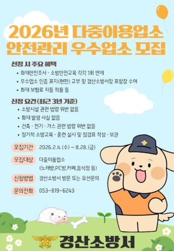 [뉴스앤톡] 경산소방서는 다중이용업소 관계인의 자율안전관리 문화 정착과 안전한 영업 환경 조성을 위해 ‘2026년 다중이용업소 안전관리 우수업소’를 선정한다고 밝혔다.
