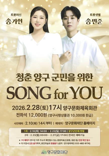 [뉴스앤톡] 양구문화재단은 다가오는 봄을 맞아 양구군민의 문화 향유 기회를 확대하고 지역에 활력을 불어넣기 위해 2월 기획 콘서트 ‘SONG FOR YOU’양구군민 콘서트를 개최한다.