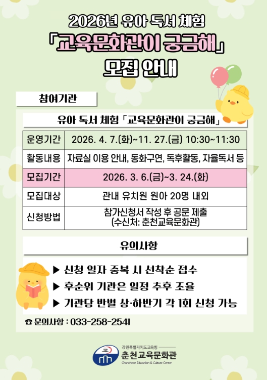 자세한 사항은 춘천교육문화관 누리집 공지사항을 참고하거나 자료실로 문의하면 된다.