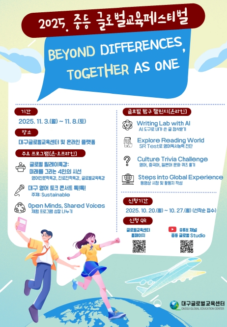 [뉴스앤톡] 대구교육연수원 산하 대구글로벌교육센터는 11월 3일부터 8일까지 ‘Beyond Differences, Together as One(차이를 넘어, 하나로)’을 주제로 '2025 중등 글로벌교육페스티벌'을 개최한다.