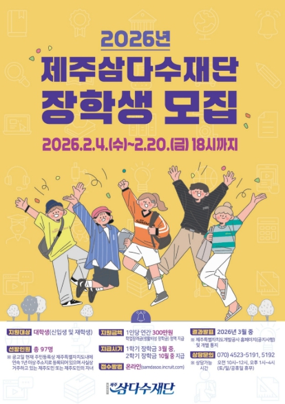 [뉴스앤톡] 재단법인 제주삼다수재단(이사장 백경훈)이 제주와 대한민국의 미래를 이끌어갈 우수 인재 양성을 위해 2026년도 제주삼다수 장학생을 모집한다.