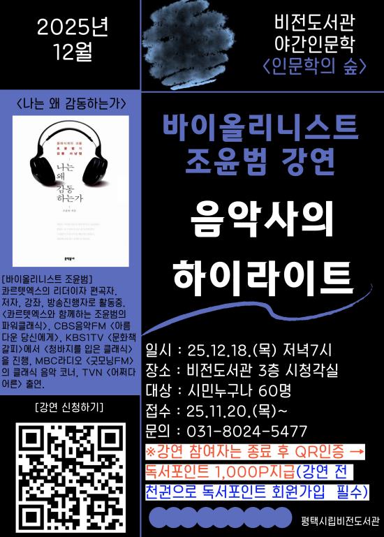 [뉴스앤톡] 평택시립 비전도서관이 오는 12월 18일 저녁 7시 조윤범 바이올리니스트를 초청하여 ‘음악사의 하이라이트’를 주제로 야간 인문학 강연을 진행한다.