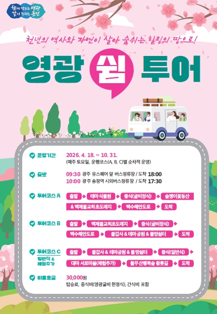[뉴스앤톡] 영광군은 4월 18일부터 10월 31일까지(7∼8월 폭염으로 제외) 토요 감성 힐링 여행‘2026년 영광 쉼 투어’를 매주 토요일 운영 한다고 밝혔다.