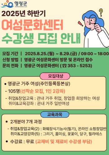 | ▲ 영광군 '2025년 하반기 여성문화센터 프로그램'수강생 모집 |