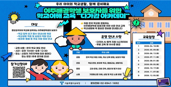 김천홍 서울시교육감 권한대행은 “익숙하지 않은 교육환경 속에서 자녀의 학습과 진로를 지원하는데 어려움을 느껴 온 보호자들이 이러한 프로그램을 통해 학교와 더 가까이 소통하고, 자녀교육의 든든한 동반자로 자리 잡길 바란다”며, “학교와 보호자가 함께 아이를 키우는 교육 환경을 만들고, 이주배경학생의 안정적인 성장과 적응을 적극 지원하겠다”라고 밝혔다.