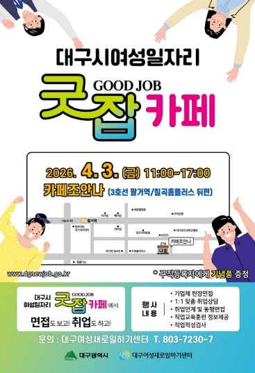 [뉴스앤톡] 대구광역시는 취업을 희망하는 경력단절 및 미취업 여성을 위해 4월 3일 오전 11시부터 북구 소재 ‘카페 조안나(칠곡점)’에서 올해 첫 ‘찾아가는 여성일자리 굿잡(Good Job)카페’를 개최한다.