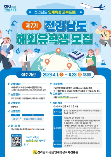 [뉴스앤톡] 전라남도와 전남인재평생교육진흥원은 글로벌 핵심 인재 육성을 위해 세계 명문대 유학 기회를 제공하는 ‘제7기 전라남도 해외유학생’을 오는 28일까지 모집한다고 밝혔다.
