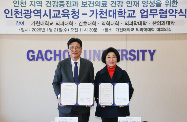 ‘가천의료융합교육 및 연구협의체’는 가천대학교 의과·간호·약학·의과학·한의학 대학 등 5개 단과대학으로 구성된 교육·연구 협의체로, 이번 협약은 인천시교육청과 가천대학교가 지역 기반 의료융합교육 협력체계를 구축하여 지역사회 건강 증진과 보건·의료 인재 양성에 기여하고자 추진됐다.