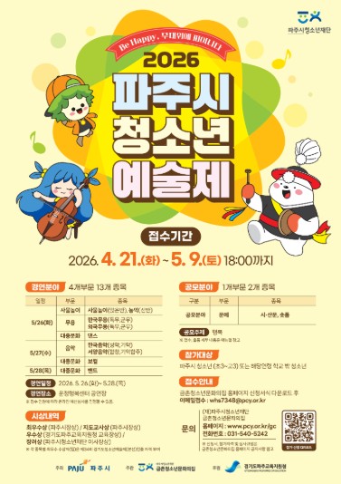 [뉴스앤톡] (재)파주시청소년재단 금촌청소년문화의집은 오는 4월 21일부터 5월 9일까지 ‘2026 파주시청소년예술제’ 참가자를 모집한다고 밝혔다. 올해‘Be Happy, 무대위에 피어나다’를 부제로 개최되는 이번 예술제는 제34회 경기도청소년예술제 파주시 공식 예선으로, 파주시 청소년이라면 누구나 참가 신청이 가능하다.