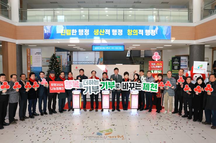 [뉴스앤톡] 제천시의회는 8일 제천시청 로비에서 열린 ‘희망2026나눔캠페인 사랑의 온도탑’ 제막식에 참석해 성금 584,000원을 기부했다.