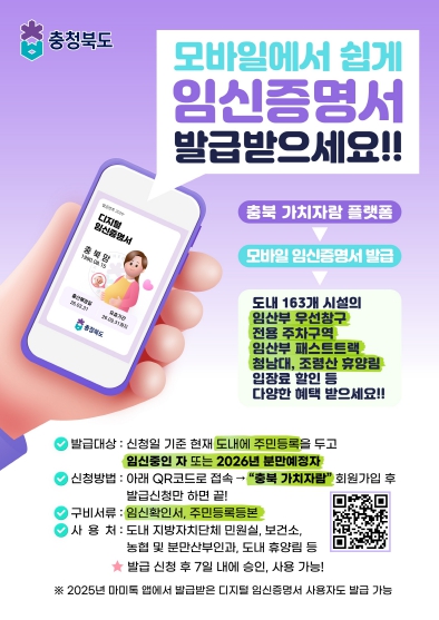 디지털 임신증명서는 2025년 민간 앱과 협업해 추진됐으나, 올해부터는 충청북도의 임신·출산·육아 종합 플랫폼인 ‘가치자람’에서 신청할 수 있도록 변경됐다. 신청 후에는 임신증명서를 이미지파일 형태로 내려받아 모바일 기기에서 손쉽게 활용할 수 있으며, 2025년 민간 앱에서 발급받았던 대상자도 동일하게 발급받을 수 있다.
