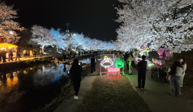 | ▲ 1. 밤 벚꽃이 만개한 원성천 일대를 찾은 시민들이 봄밤의 정취를 즐기고 있다. |