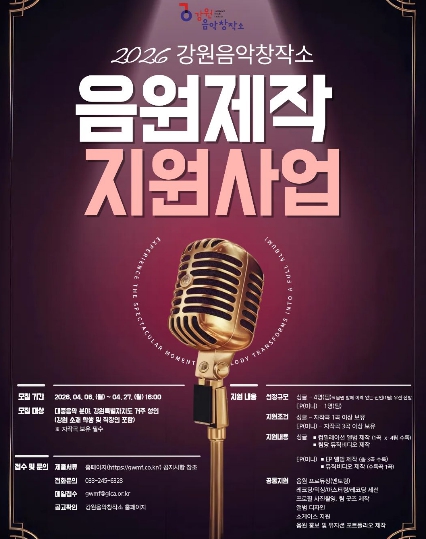 [뉴스앤톡] 강원음악창작소가 오는 27일까지 도내 역량 있는 뮤지션을 발굴하기 위해 ‘2026년 음원제작 지원사업’의 참여자를 모집한다.