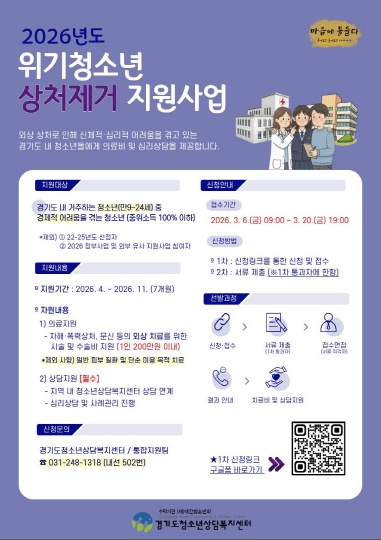 지원 대상은 경기도에 주민등록을 둔 9~24세 청소년이다. 도는 경제적 어려움과 상처 특성, 치료 동기와 의지 등을 고려해 최종 대상자를 선정하고, 최대 200만 원의 치료비와 지역 청소년상담복지센터 연계 심리상담 서비스를 함께 제공할 계획이다.