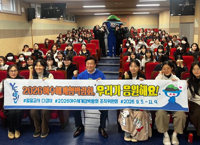 [뉴스앤톡] (재)2026여수세계섬박람회 조직위원장 정기명 여수시장이 섬박람회를 알리기 위해 여수 중앙여자고등학교에 일일교사 다섬이로 나섰다.