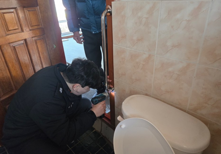 | ▲ 28.(수) 119생활안전순찰대가 독거노인가구 화장실에 안전손잡이를 설치하고 있다. |