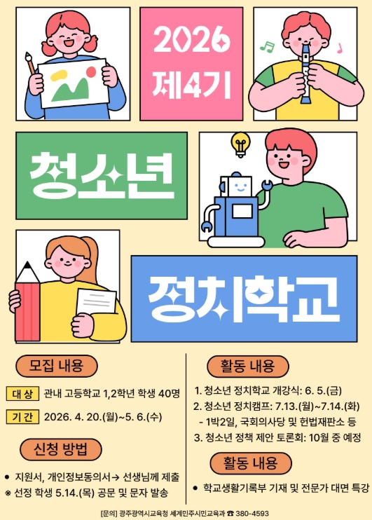 [뉴스앤톡] 광주시교육청은 청소년의 정치참여 역량을 키우기 위해 ‘제4기 청소년 정치학교’ 참가자를 모집한다.