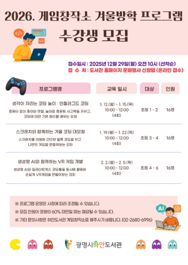 [뉴스앤톡] 광명시 게임창작소는 오는 29일 오전 10시부터 겨울방학 프로그램 수강생을 모집한다.