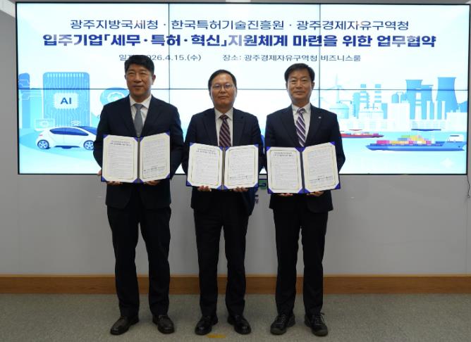 [뉴스앤톡] 광주경제자유구역청은 15일 경자청 비즈니스룸에서 광주지방국세청, (재)한국특허기술진흥원과 ‘광주경제자유구역 핵심 전략산업 기업 육성 및 기술 경쟁력 강화를 위한 업무협약’을 체결했다.