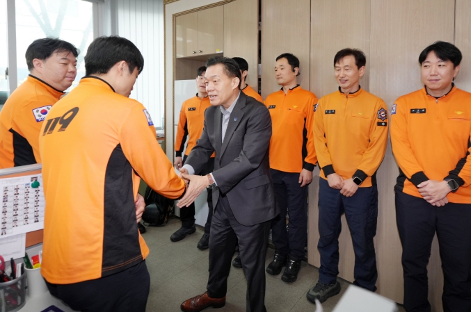 | ▲ 이재준 수원시장이 수원남부소방서 근무자들을 격려하고 있다. |