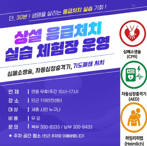 이번 체험장은 3년 연속 심정지 환자 자발순환 회복률 전국 1위 성과를 거둔 안전도시 세종에 더욱 촘촘한 사회 안전망을 구축하기 위해 마련됐다.