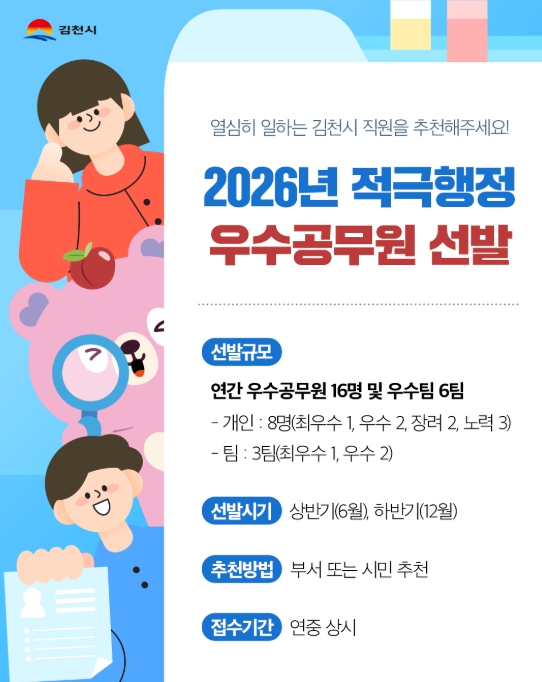 [뉴스앤톡] 김천시는 행정서비스 향상과 공익 증진, 사회문제 해결을 위해 2026년도 적극행정 우수공무원을 선발한다고 밝혔다.