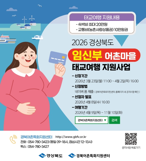 [뉴스앤톡] 경상북도는 저출생 문제를 해결하고 어촌지역 활성화를 위하여 3월 23일부터‘임신부 어촌마을 태교여행’모집을 실시한다고 밝혔다.