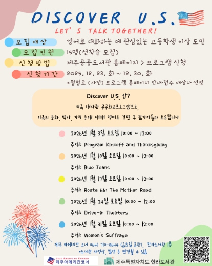 [뉴스앤톡] 제주특별자치도 한라도서관은 주한미국대사관과 협력해 도민의 글로벌 이해와 영어 활용 역량 강화를 위한 교육 프로그램 ‘Discover U.S.’를 올해부터 운영한다고 밝혔다.