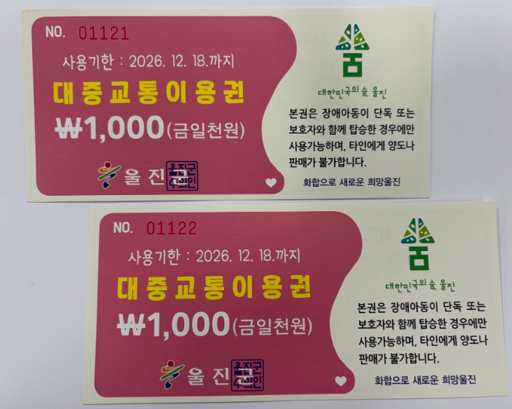 지원 대상자는 1인당 월 6만 원의 대중교통 이용권을 수령한 후 관내 지정 대중교통업체인 개인택시, 울진택시, 동해택시, 교통약자이동지원센터에서 이용권 한도 내로 2026년 12월 18일까지 사용할 수 있다.