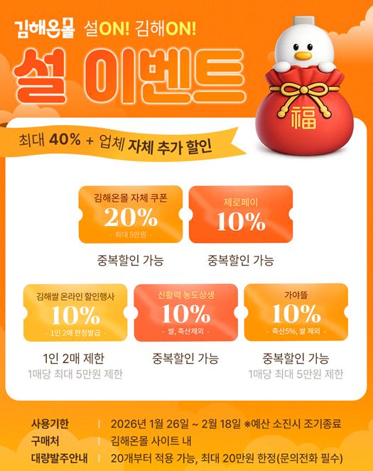 김해시 온라인 통합 쇼핑몰 ‘김해온몰’에서 진행하는 ‘설ON! 김해ON!’ 행사와 함께 진행되는 이번 행사에서는 김해시 공동 브랜드인 가야뜰 제품과 지역 우수 농특산물을 파격적인 가격에 만나볼 수 있다.