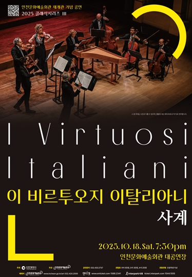 [뉴스앤톡] 인천광역시 문화예술회관이 전관 재개관을 기념해 10월 18일 인천문화예술회관 대공연장에서 2025 클래식 시리즈 세 번째 무대를 선보인다. 이탈리아를 넘어 국제적으로 명성을 쌓아온 ‘이 비르투오지 이탈리아니’를 초청해 환상적인 연주를 펼쳐 보인다.