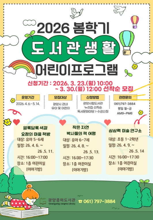 [뉴스앤톡] 광양중마도서관은 오는 4월 6일부터 5월 14일까지 6주간 유아(5~7세)와 초등학교 1~2학년을 대상으로 봄 학기 어린이 프로그램에 참여할 수강생을 모집한다고 밝혔다.
