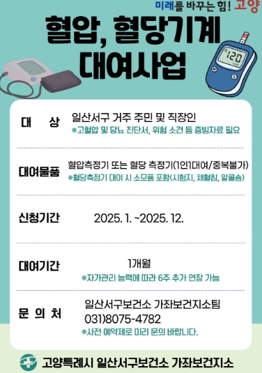 [뉴스앤톡] 고양특례시 일산서구보건소 가좌보건지소는 일산서구 주민들 중 고혈압, 당뇨 유질환자이거나 전 단계 소견을 받은 주민들을 대상으로 혈압·혈당계 대여사업을 진행한다고 밝혔다.