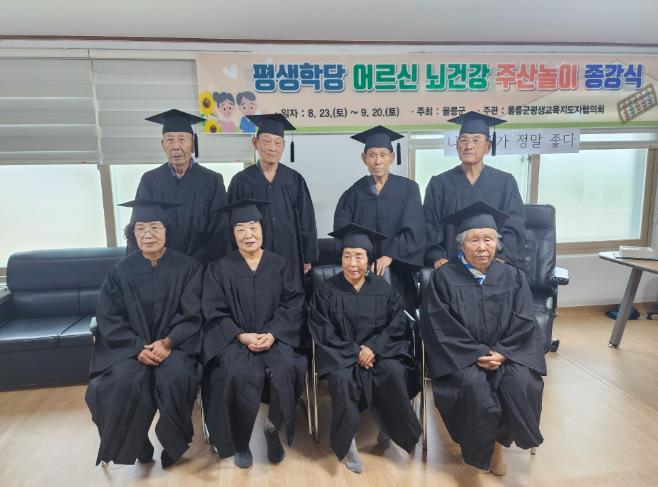 찾아가는 동네 경로당 수업은 어르신들의 건강한 신체활동과 치매예방 등 건강한 노후생활을 위하여, 지난 8월부터 매주 금요일과 토요일 5주간 총 8회에 걸쳐 진행된 프로그램으로 주산교실, 터링수업 등으로 구성되어 석포경로당과 나리경로당에서 각각 진행했으며, 프로그램 강사들은 울릉군평생교육지도자협의회 회원들로 구성됐다.