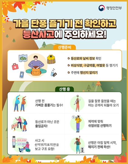 [뉴스앤톡] 행정안전부는 가을 단풍철을 맞아 산행 시 실족이나 조난 등 안전사고 예방에 각별히 주의할 것을 당부했다.