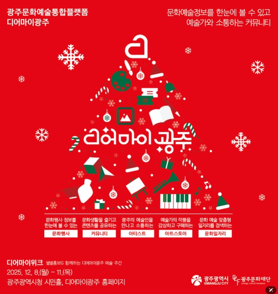[뉴스앤톡] 광주문화예술통합플랫폼 ‘디어마이광주’의 오프라인 축제 ‘디어마이위크’가 12월 8일부터 11일까지 광주광역시청 1층 로비에서 열린다. 올해 축제는 광주광역시 홍보 성과 공유회 ‘2025 별별홍보G’와 연계하여, 문화예술을 기반으로 한 새로운 지역 홍보 모델을 제시하는 데 의미를 두고 있다.